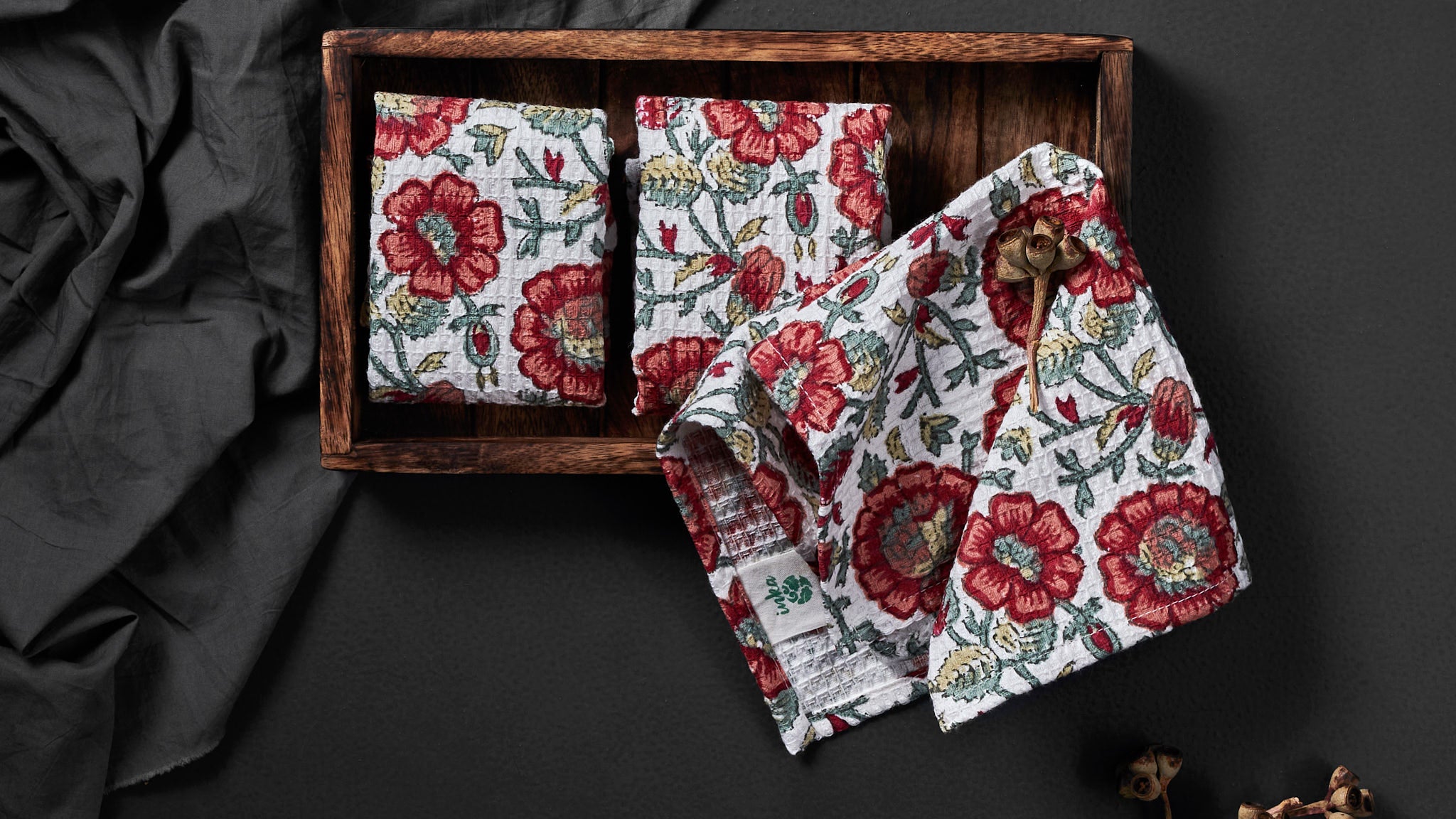 Our vibrant and beautiful Dahlia symbolises positivity, resilience and happiness. Our rendition of this beautiful floral, with tiny starburst blooms is printed in hues of lime, peach and green. 100% cotton. Waffle weave. Printed by hand. Our square face towels come as a set of 6 made in waffle fabric that is highly absorbent and quick drying. They can be used as face towels, guests towels and are easy to pack for picnics or travelling.