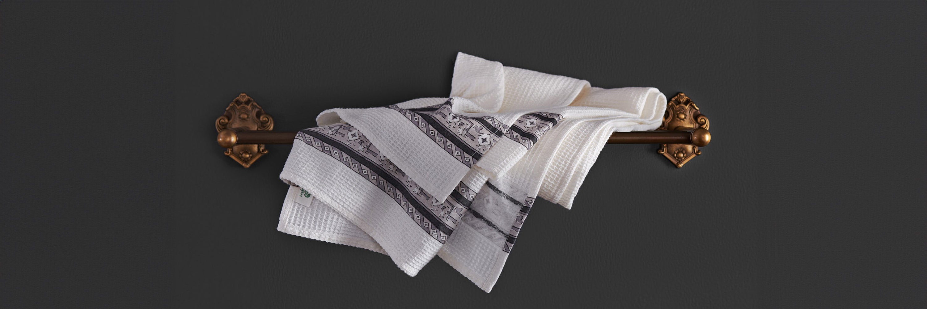 100% cotton. Waffle weave. Printed by hand. Our bath towels are made in waffle fabric that is highly absorbent and quick drying. Bath towels feature a handprinted border along the two shorter sides and can be purchased individually or with the matching shampoo towel as a set.