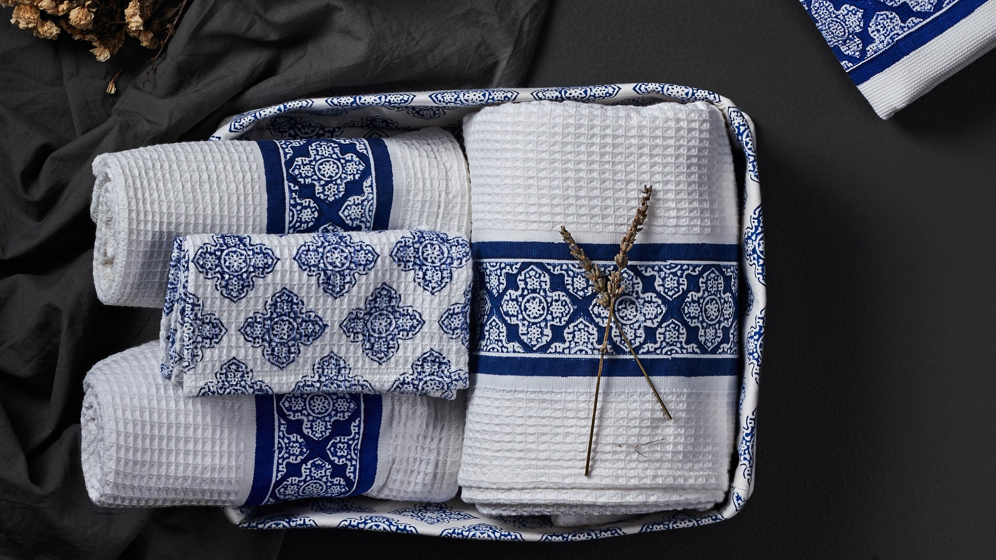 Our Jali print is inspired by traditional Indian lattice stonework. In the Jali bath collection this intricate motif is printed in indigo.